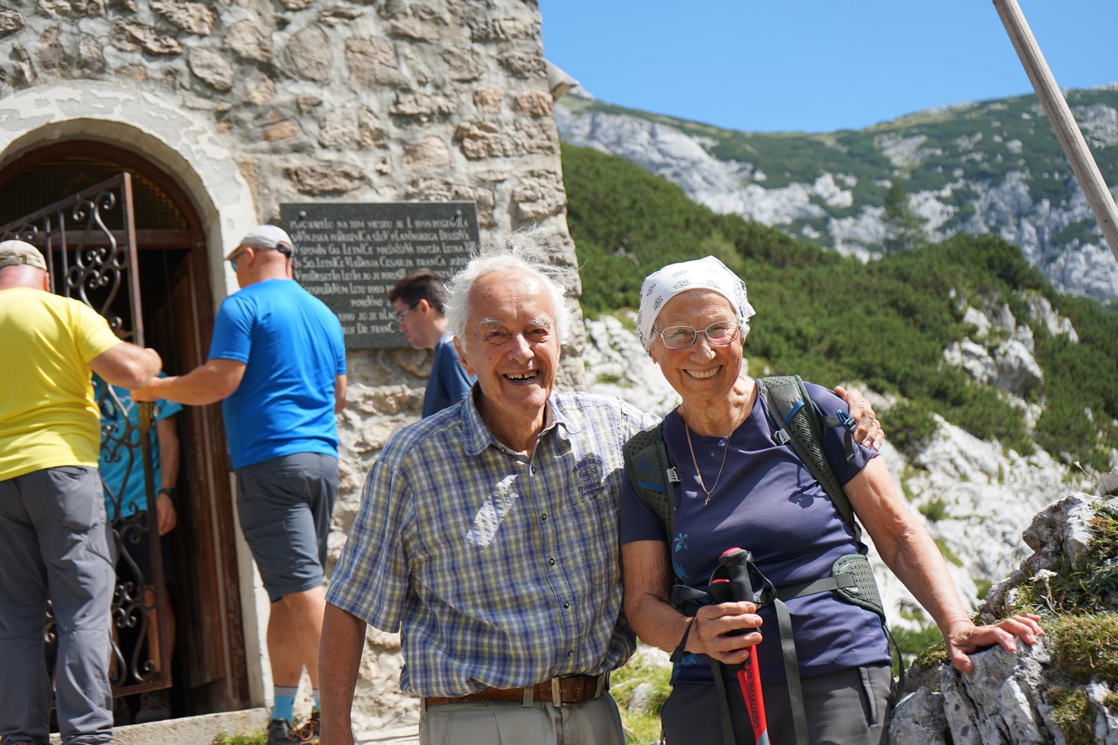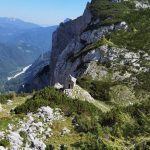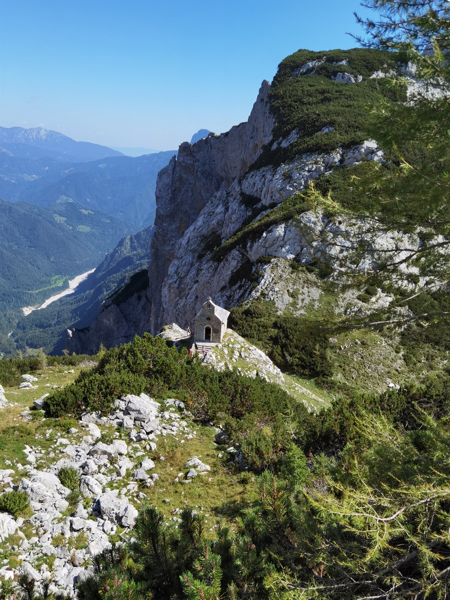 Nekateri smo romanje pričeli že precej zgodaj (ob 4h zjutraj štart iz Trzina), saj smo želeli karseda dobro izkoristiti dan in zato priložnost, da se (eni ponovno, drugi prvič) povzpnemo preko Male Ojstrice (2017 m) tudi na Ojstrico (2350 m) še pred sv. mašo. Z lučkami na glavi smo si prve pol ure osvetljevali dobro shojeno in označeno planinsko pot, ki je vodila najprej do koče na Podvežaku, potem pa strmo v breg skozi ruševje in gozdičke, čez prag in med skalovjem. Od daleč smo že urzli Ojstrico, obsijano od prvih jutranjih žarkov, ki so polagoma dosegli pobočja Male Ojstrice in tudi nas; hitro je čelo postalo potno, še toliko bolj, saj smo ravno zagrizli precej navkreber do prvega počitka pri miniaturnem Aljaževem stolpu na Mali Ojstrici. Seveda smo nekoliko stopili s poti, da smo spodaj na pečini uzrli kapelo sv. bratov Cirila in Metoda in zraven staro Kocbekovo kočo, s katere dimnika se je že lepo kadilo, kar je naznanjalo, da je oskrbnik koče , Tone, očitno že pri obedu in verjetno že pričakuje prve planince, da se oglasijo na čaju ali kavi. Kako čudovito je to božje stvarstvo, ko se ozreš krog in krog! Še malo smo posedeli, potem pa zagrizli še bolj v skalo do vrha Ojstrice, kjer smo si privoščili malico s popotne torbe. “Sedaj se moramo pa kar podvizati” je rekel drugi Miha “če želimo priti pravi čas na mašo.” Kakopak, saj to je bil ravno naš primarni namen!
