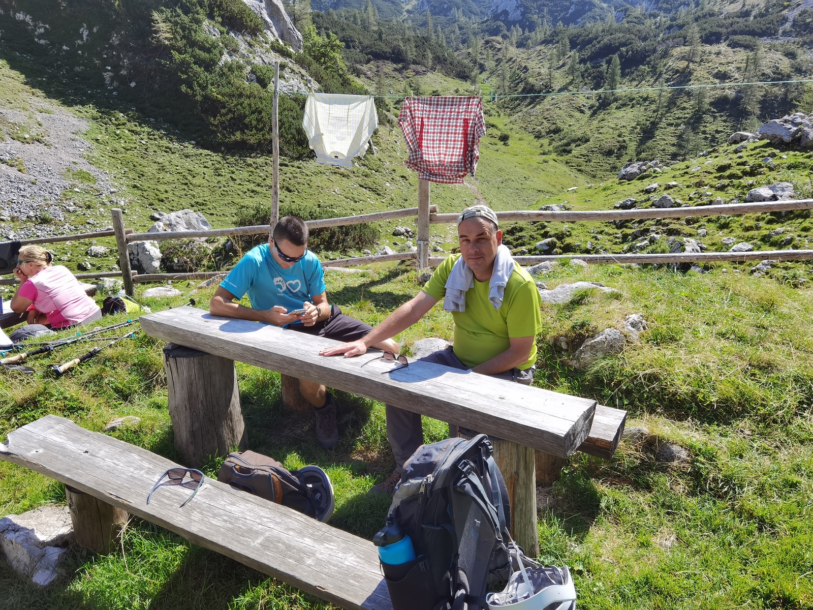 Preostali romarji so se ob 7h zbrali v Trzinu, drugi v Mengšu, in se s svojimi vozili (oz. v vozilih drugih romarjev) odpeljali proti izhodišču, Podvežaku, kjer je bilo jutro že v polnem razmahu, vreme pa naravnost enkratno za planinarjenje. Tudi med njimi je bila prisotna dobra volja vso pot do Moličke. Eni s hitrejšim, drugi z nekoliko počasnejšim korakom – a važno da je bilo varno in da smo vsi dosegli naš cilj na polovici poti, kjer se je ob našem povratku z Ojstrice zbralo že kakih petnajst ali dvajset romarjev, pa tudi drugih obiskovalcev (planincev), ki so si za ta dan izbrali ta del Kamniško-Savinjskih alp.